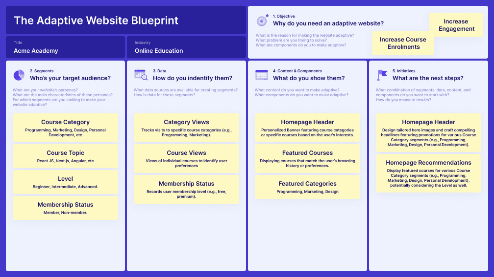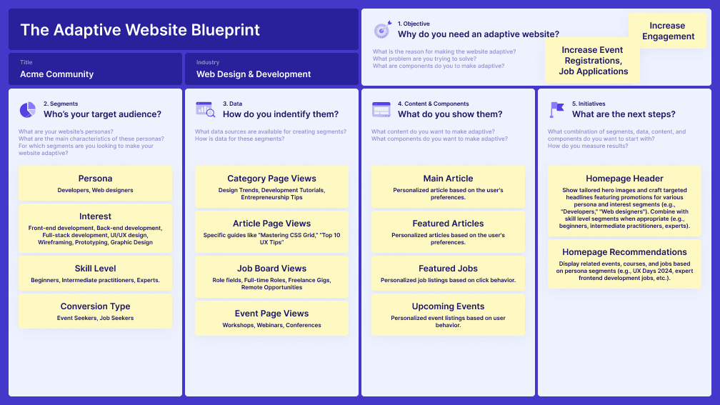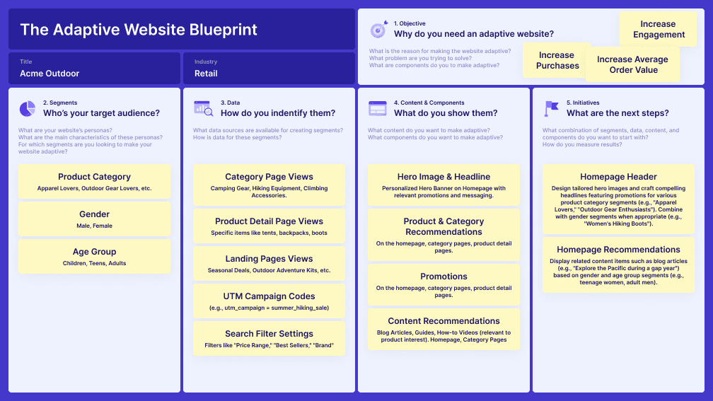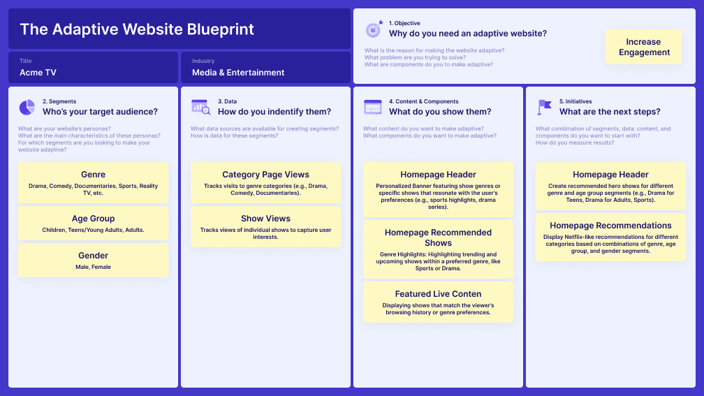 To make sure your adaptive efforts are structured and everyone on the team is aligned, you need an adaptive website blueprint. This blueprint serves as a strategic framework, showing how your site will adjust its content, design, and user experience based on each visitor’s preferences and behavior.