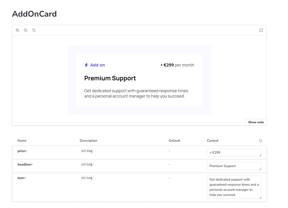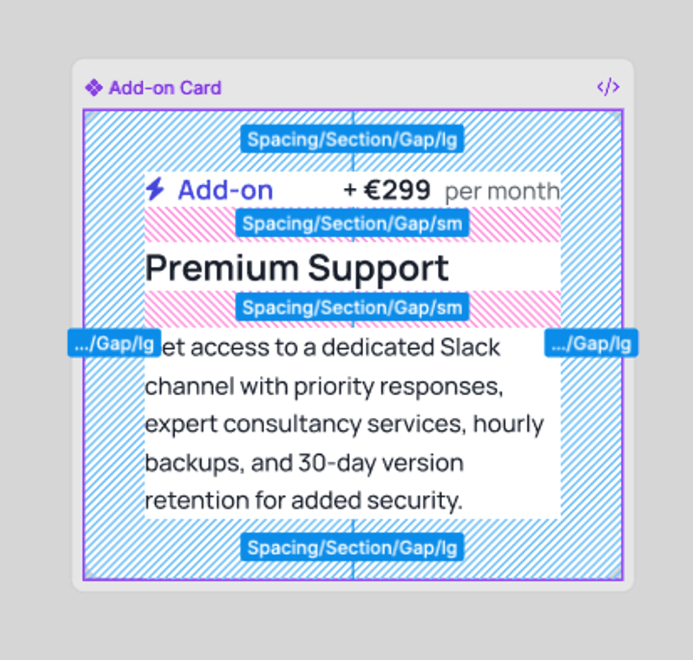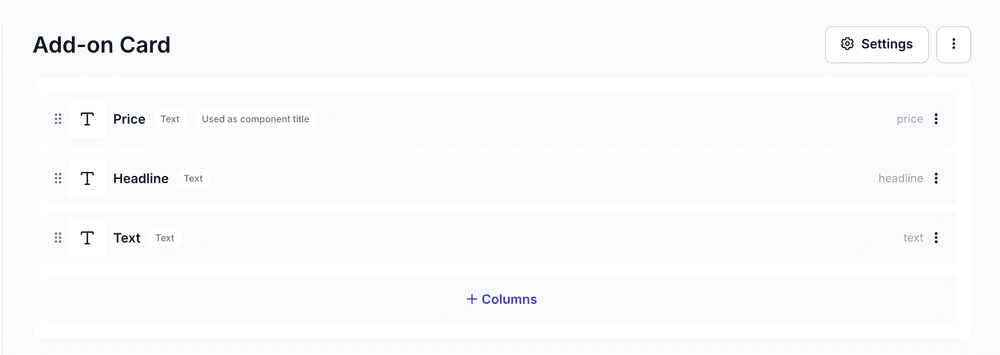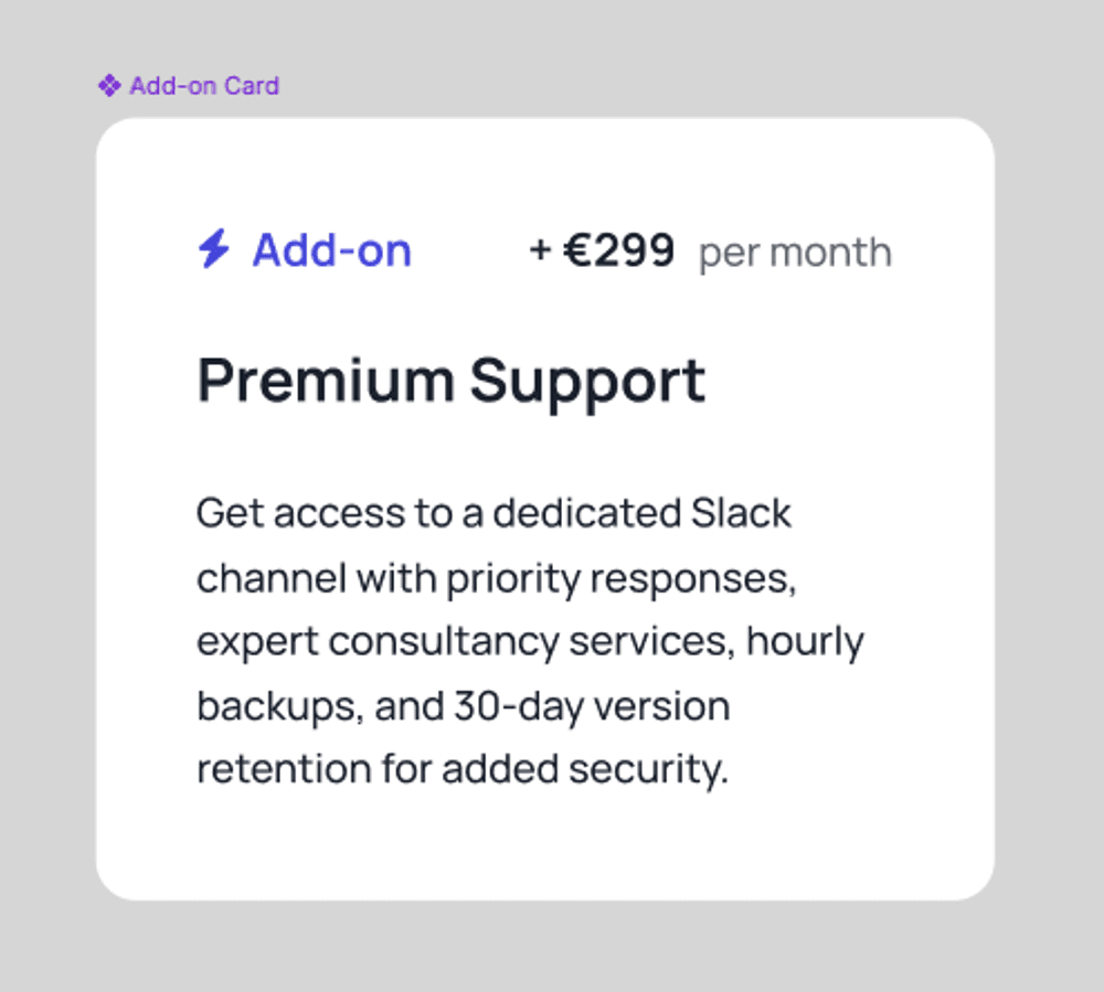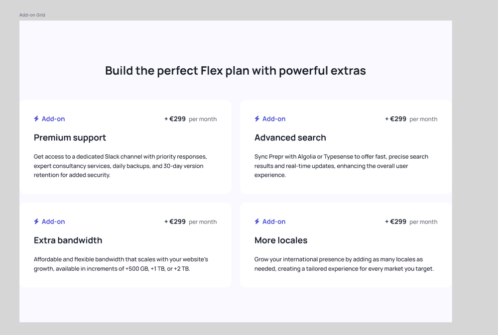The component itself is fairly straightforward, but it still includes both static and dynamic elements. The icon and the “Add-on” label are fixed, while the price, headline, and supporting text need to come from Prepr.