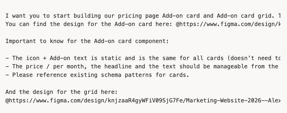 We provided the Figma designs, explained which content should be static versus dynamic, referenced existing schema patterns, and described where the component would be used.