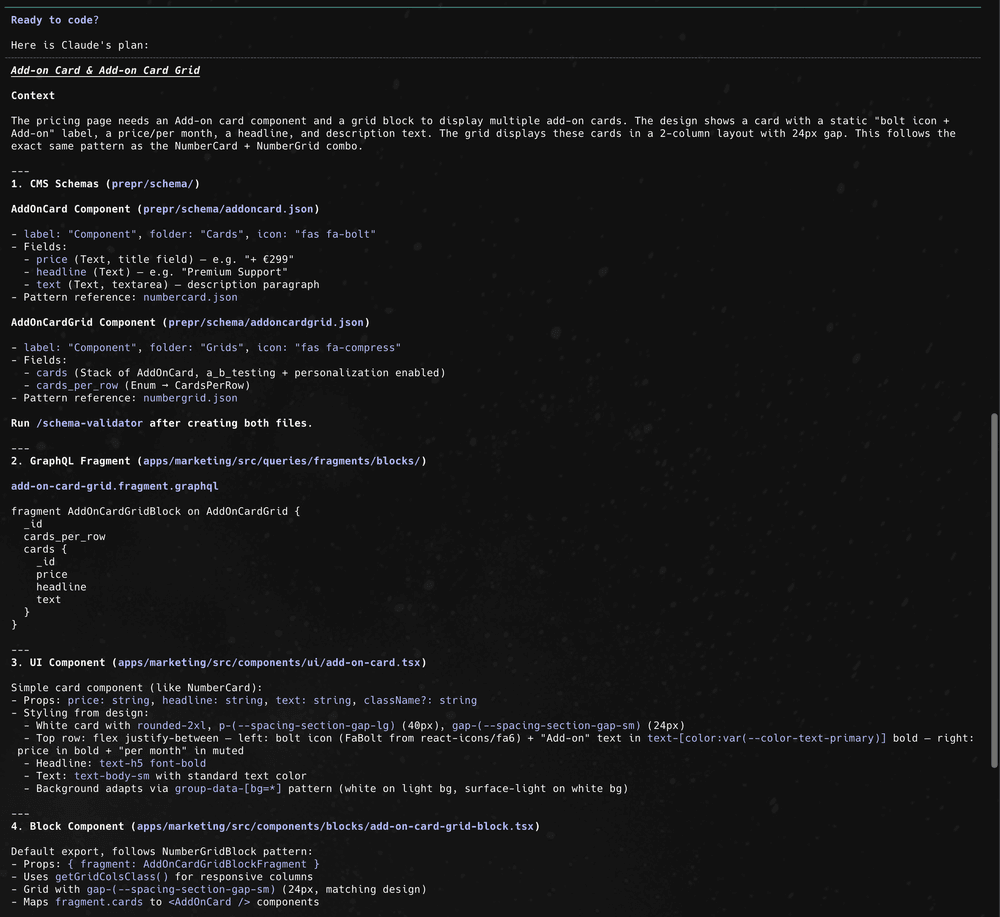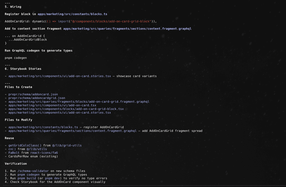 Based on that input, Claude generated a full implementation plan covering the schema, GraphQL fragment, component files, block registration, Storybook stories, and validation steps.