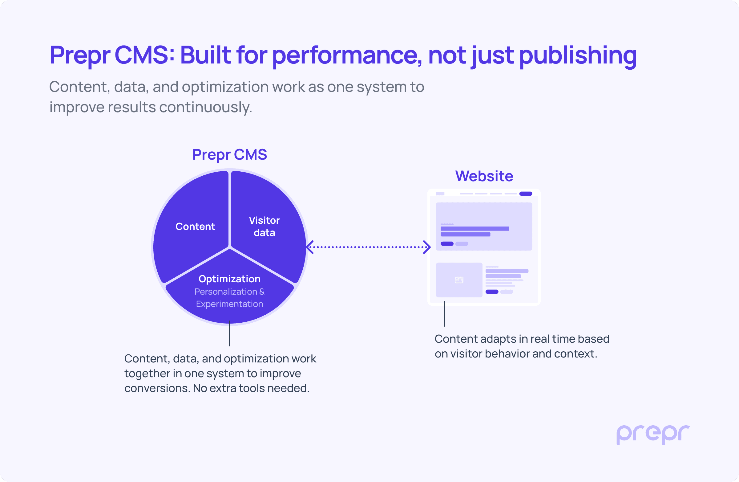 Prepr takes a different approach. It brings content, visitor data, personalization, and A/B testing together in one platform, so teams can adjust what visitors see without relying on a fragmented stack. Instead of adding layers, the core system supports continuous improvement.