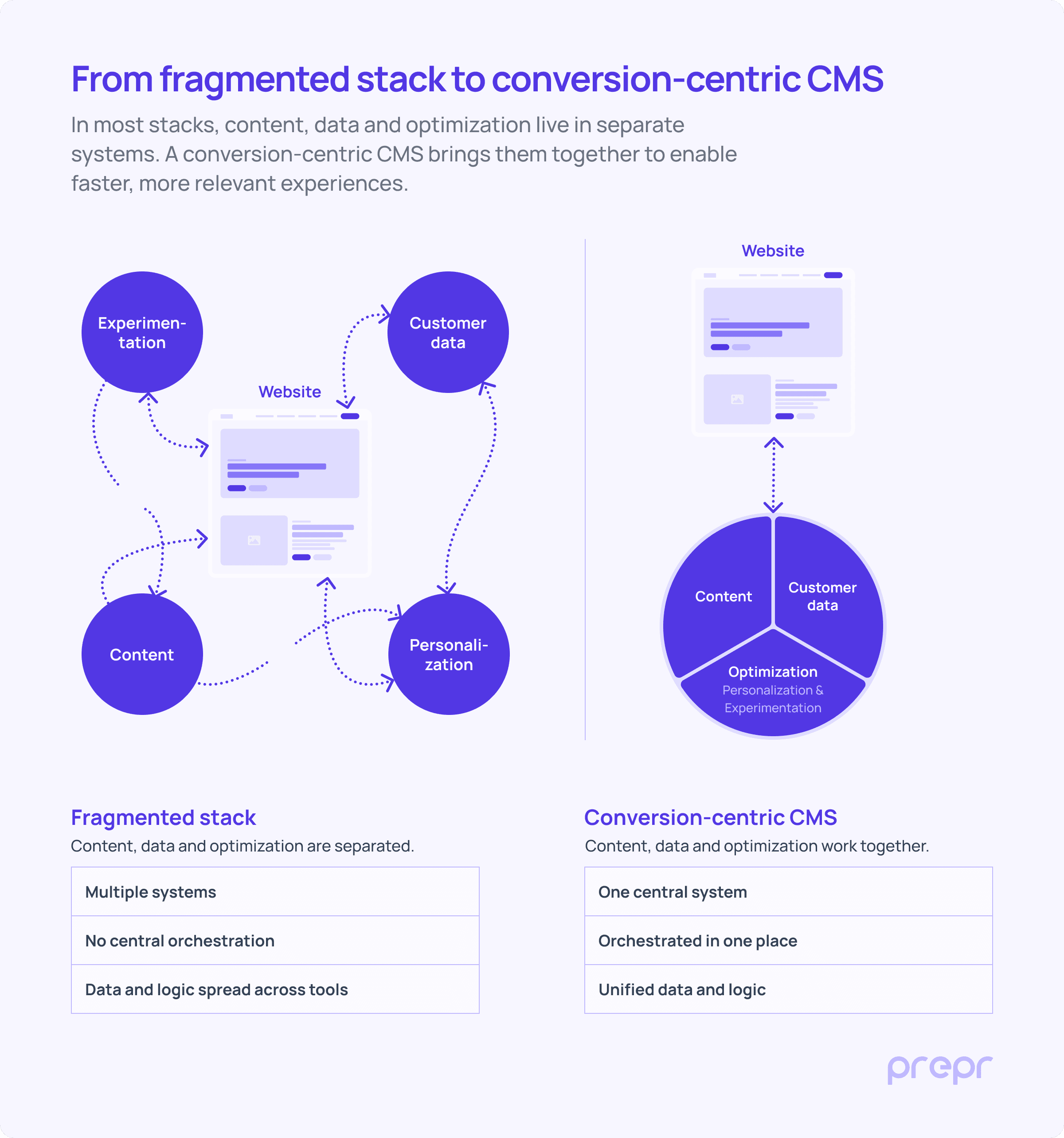 A comparison between a fragmented stack with separate systems and a unified CMS where content, data, and optimization are managed together.