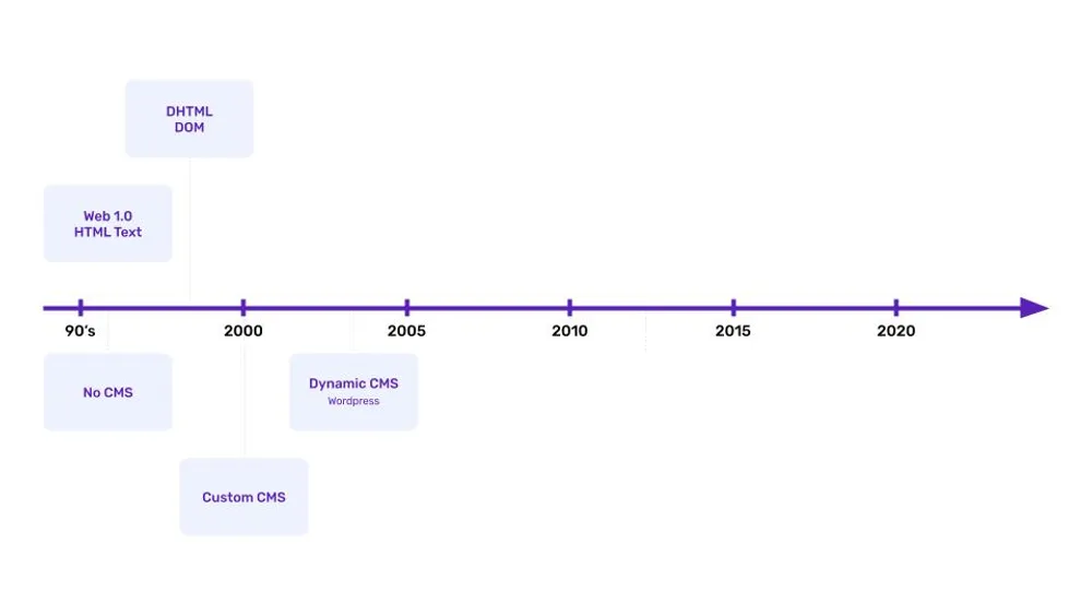 Dynamic HTML (DHTML) was a big step forward in web development in the late 1990s and early 2000s. It allowed developers to make web pages more interactive by changing the Document Object Model (DOM). After DHTML, the first content management systems (CMS) appeared. These early CMS platforms, like Blogger and WordPress, made it easier for website owners to update and maintain their sites by separating content from design. These early systems set the stage for future-proof CMS solutions like headless CMS, which offers greater flexibility and adaptability in the digital world.