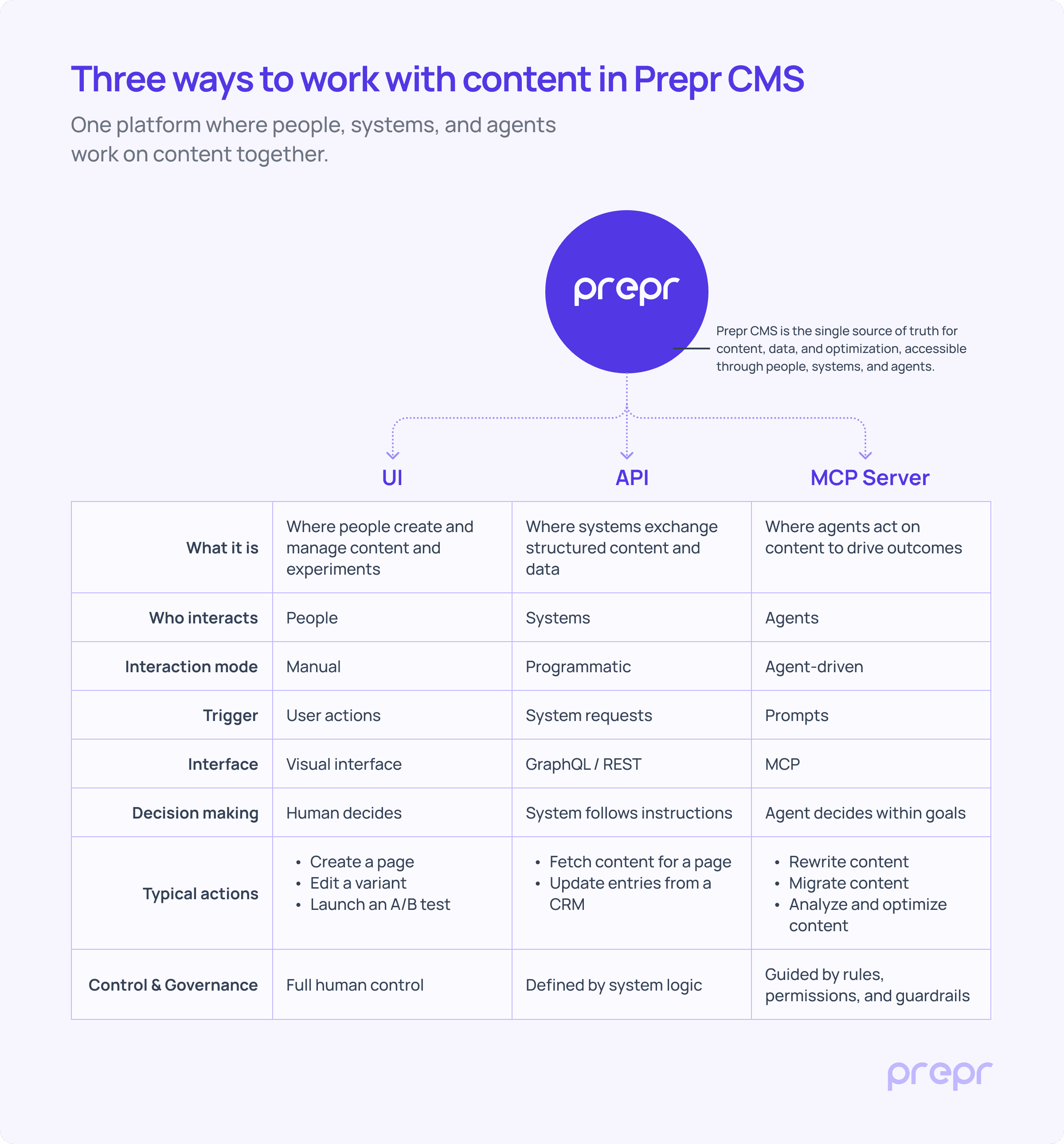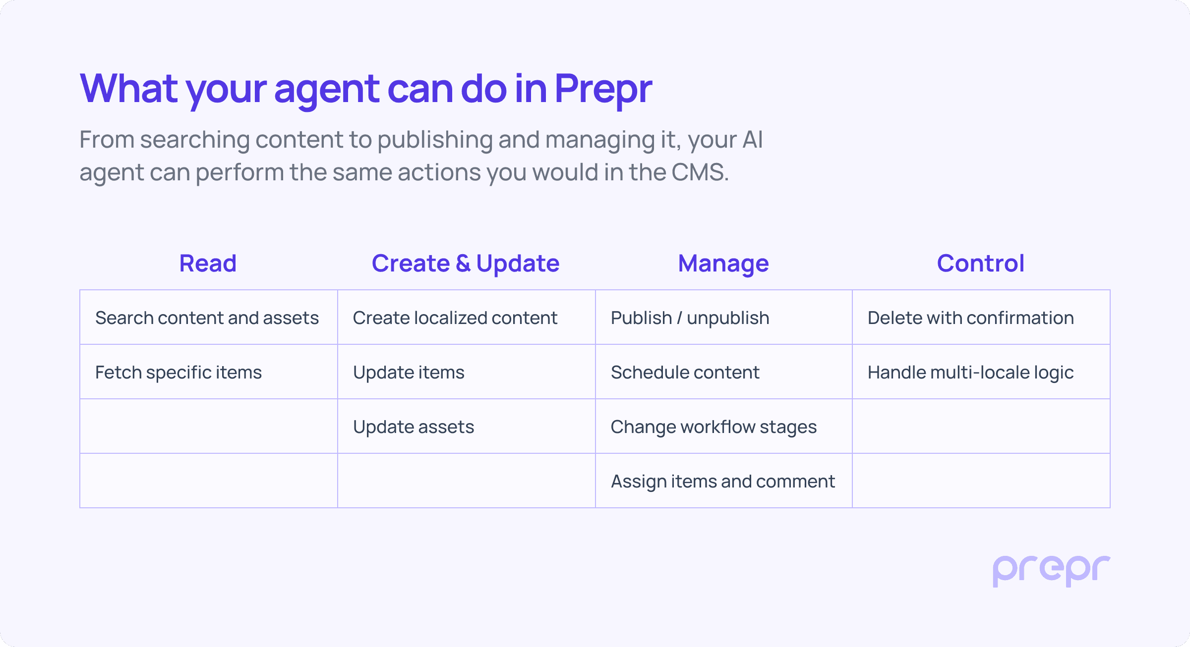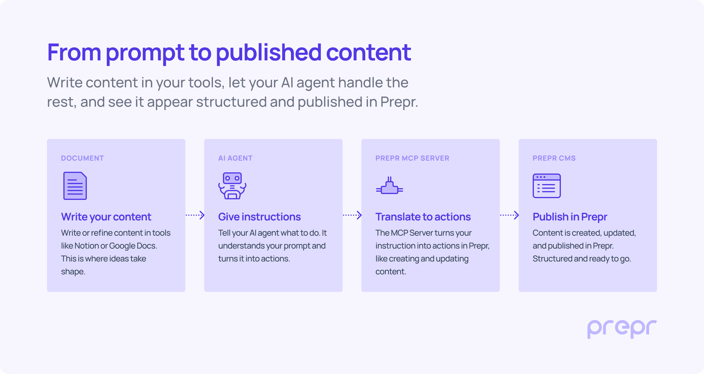 It allows AI agents to work directly with content in Prepr, instead of stopping at content creation. Content written in tools like Google Docs or Notion can be turned into structured items in the CMS, assigned to a teammate, and moved forward without going through the usual manual steps.