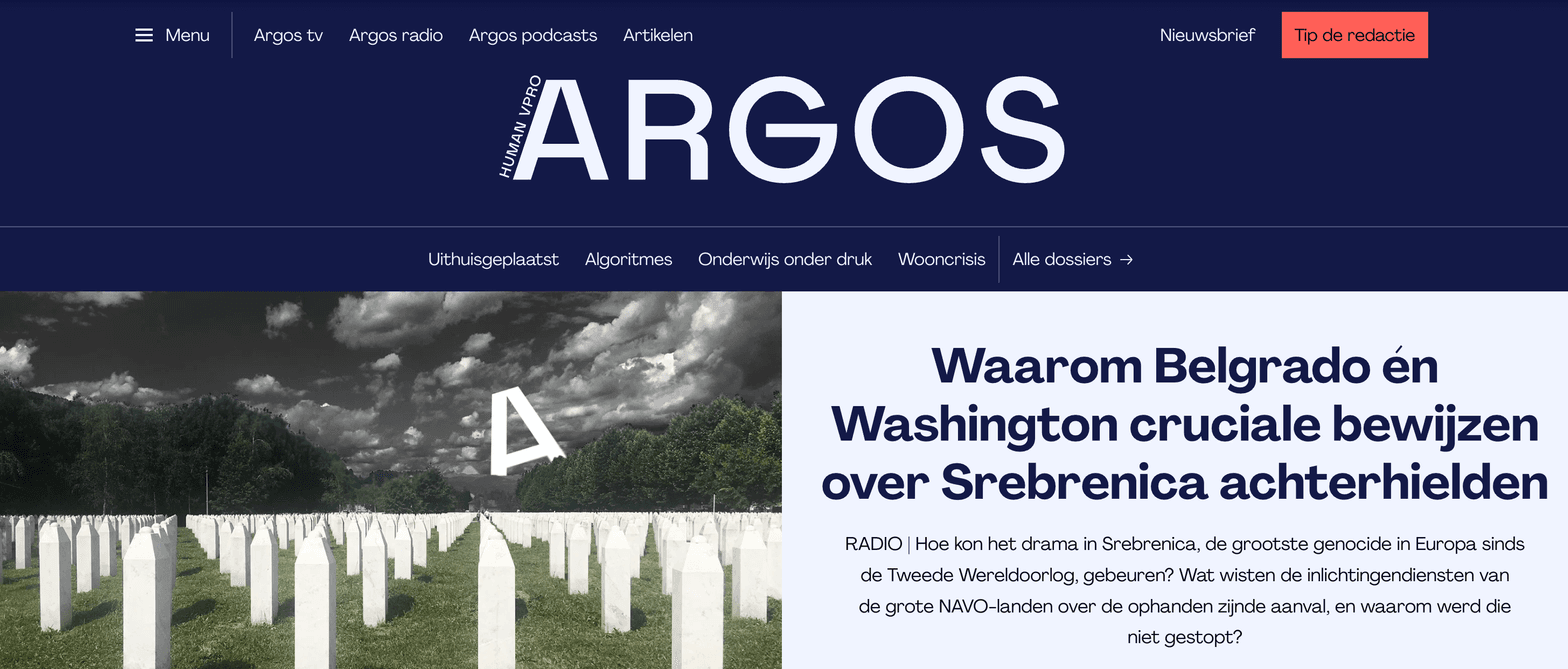 Argos is a leading investigative journalism platform jointly operated by HUMAN and VPRO. Known for its in-depth narrative journalism and well-researched stories, Argos goes beyond daily headlines to uncover stories that politicians and administrators would prefer to keep hidden. The platform takes pride in its role as a watchdog, exploring unique angles that other media outlets might overlook while maintaining transparency about their journalistic choices. Their content is available through multiple channels, as a weekly radio program, television broadcasts, and online platforms, including podcast series. The show airs biweekly on NPO Radio 1, makes several appearances throughout the year on NPO2, and maintains a constant online presence.