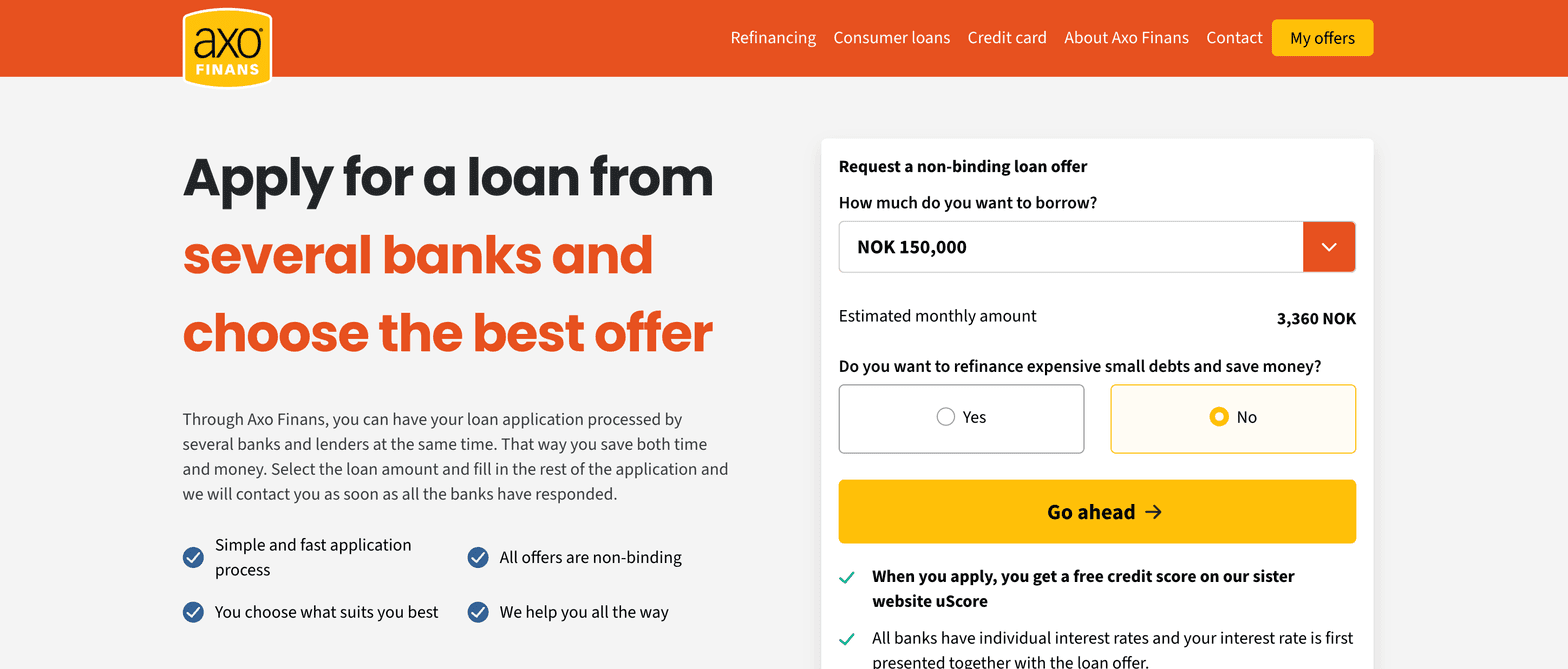 Axo Finans, Norway's largest financial agent, specializes in mediating consumer loans, refinancing, and credit cards. Founded in 2008 by banking sector veterans Stig Arff and Morten Armand Johansen, the company has expanded its services across all Nordic countries, with its headquarters in Oslo. Axo Finans distinguishes itself by offering a unique comparison service that allows customers to simultaneously apply for loans from multiple banks and financial institutions. This approach not only saves time but also ensures clients can access the most competitive loan terms tailored to their specific needs. With a commitment to simplicity and efficiency, Axo Finans aims to streamline the loan application process, providing customers with a clear overview of available options and guiding them through every step of their financial journey.