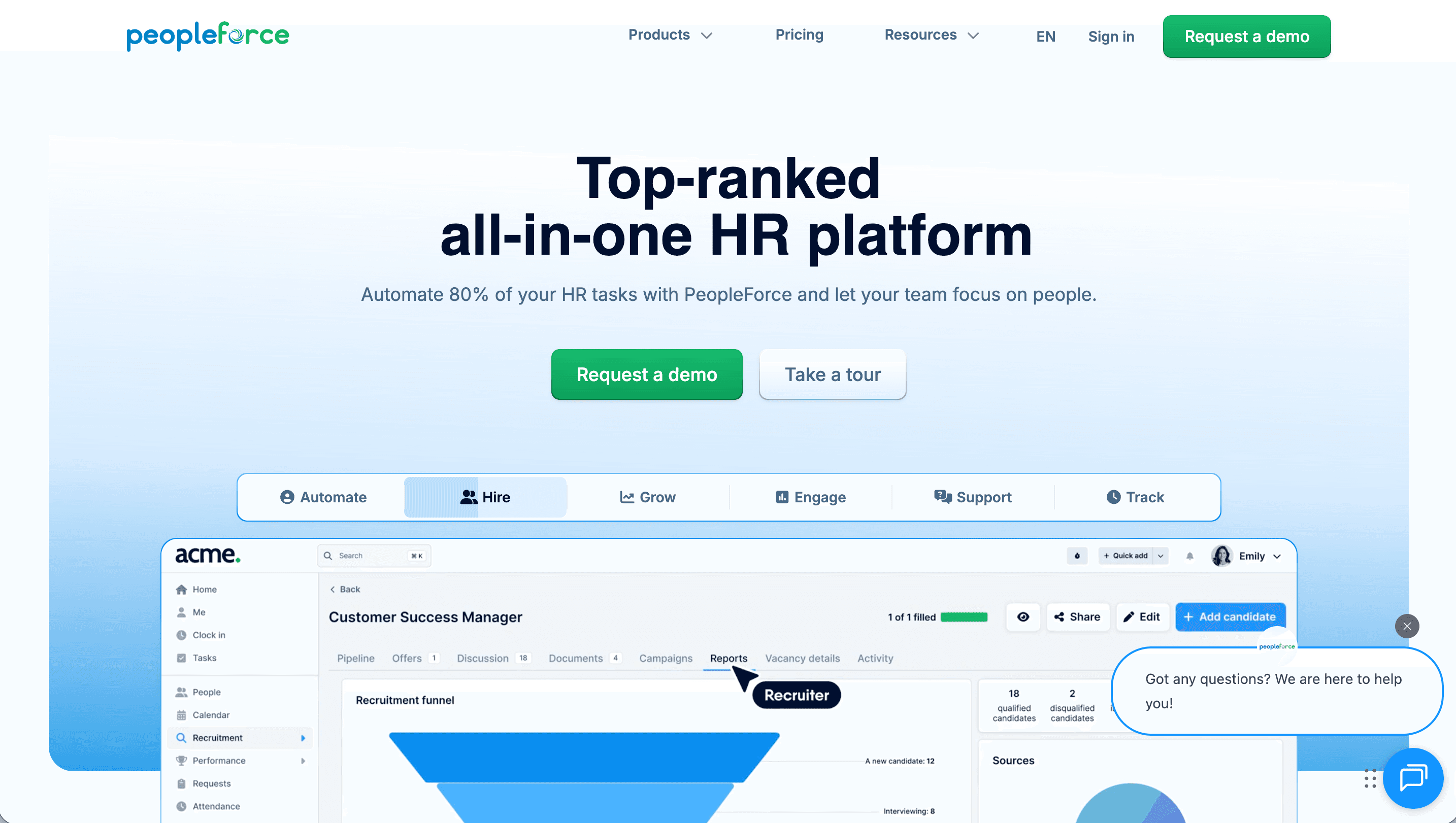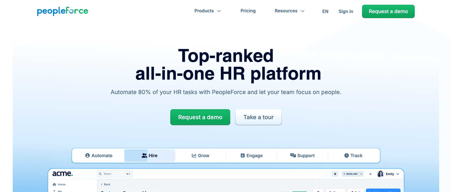 PeopleForce’s homepage uses a single hero message for every visitor. The message explains the product clearly, but it does not change based on who is visiting the site.