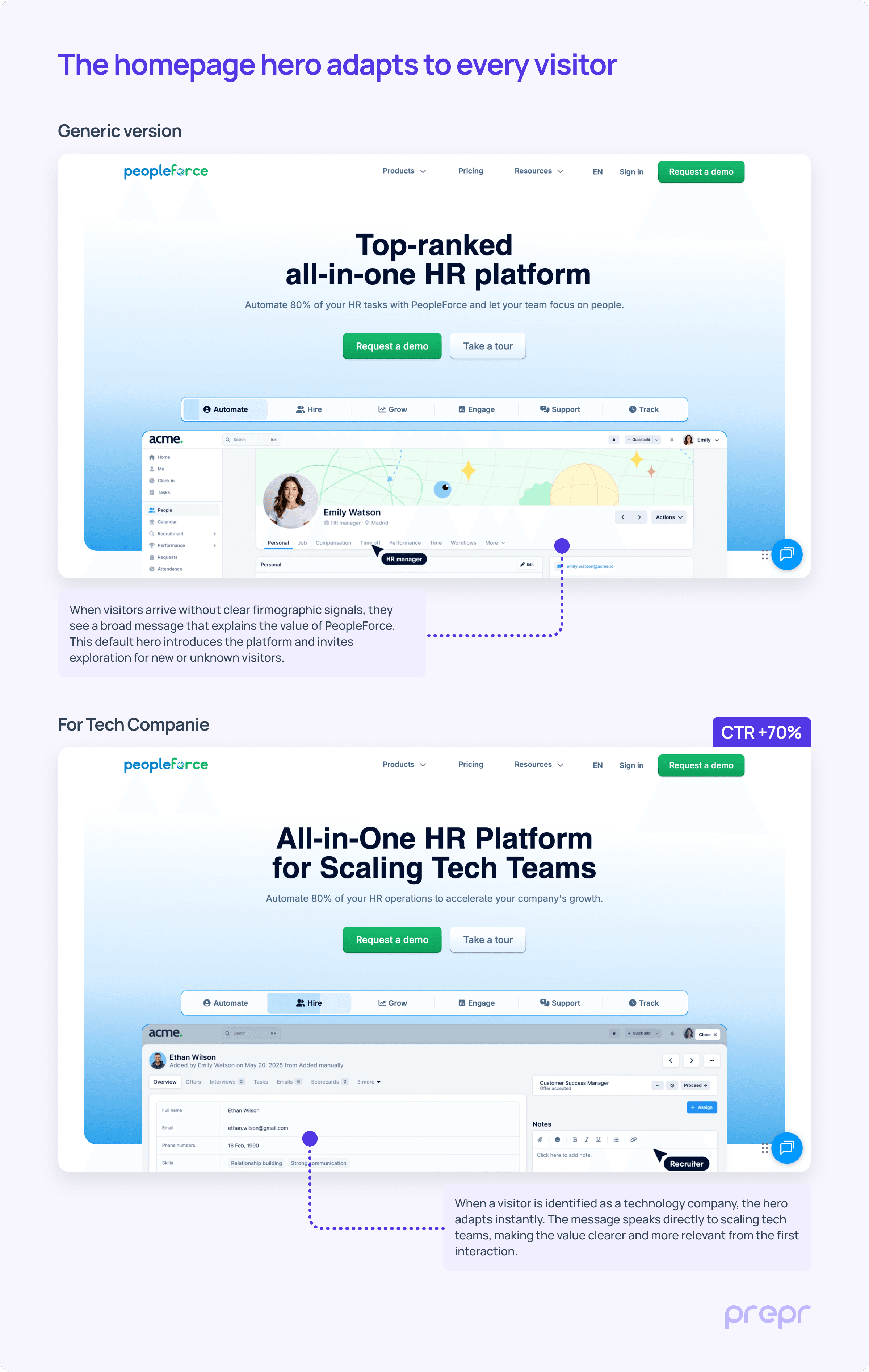 As traffic grew, the team began to look more closely at homepage performance. A large share of visitors comes from technology companies, an audience the team wanted to resonate with more strongly. While the generic hero message positioned PeopleForce as a top-ranked, all-in-one HR platform, it did not explicitly reflect who these visitors were or speak directly to their identity as scaling tech teams.
