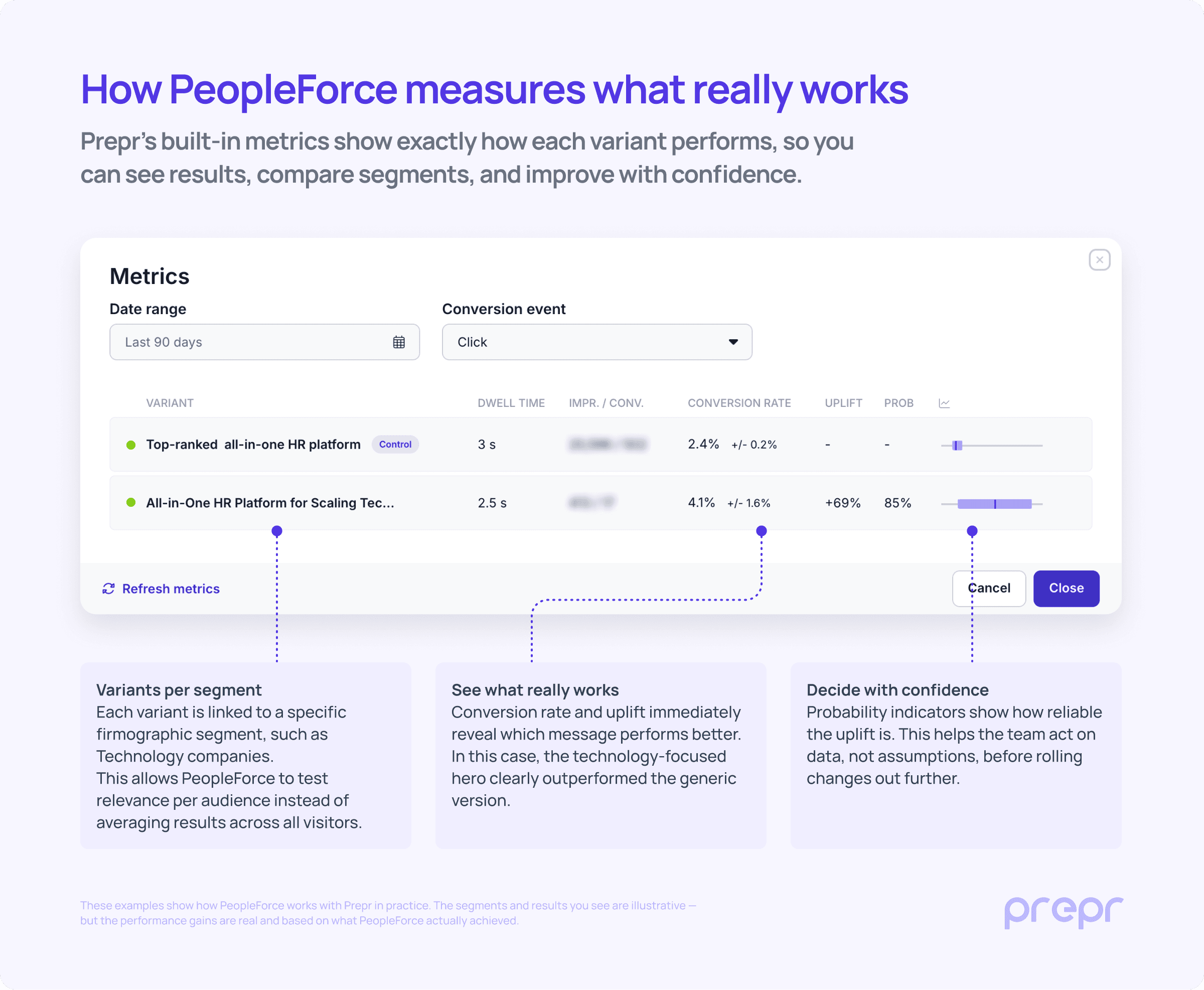 To find out, PeopleForce needed a way to test the impact of personalization on the hero click-through rate directly. The experiment had to run on the existing homepage, without a redesign, and produce results that are easy to compare. If it works, the setup should also be simple enough to extend to other audience segments.