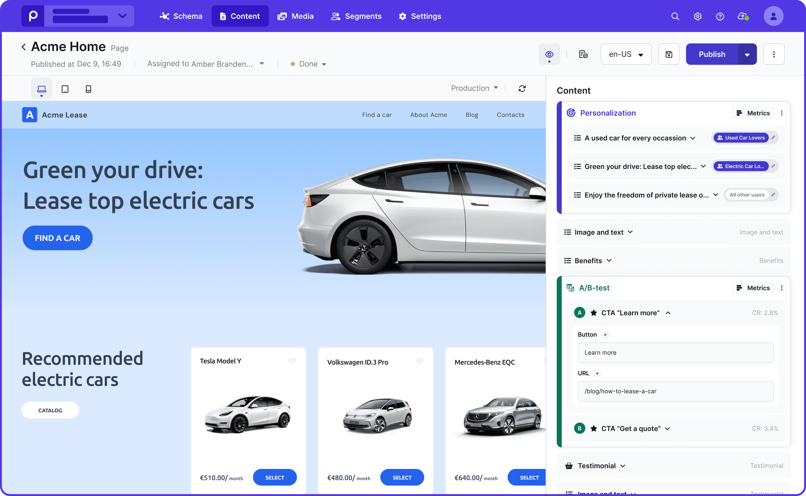 Spend less time configuring and more time building. Prepr comes ready with advanced features like personalization, A/B testing, and visual preview: no extra tools or plugins needed.