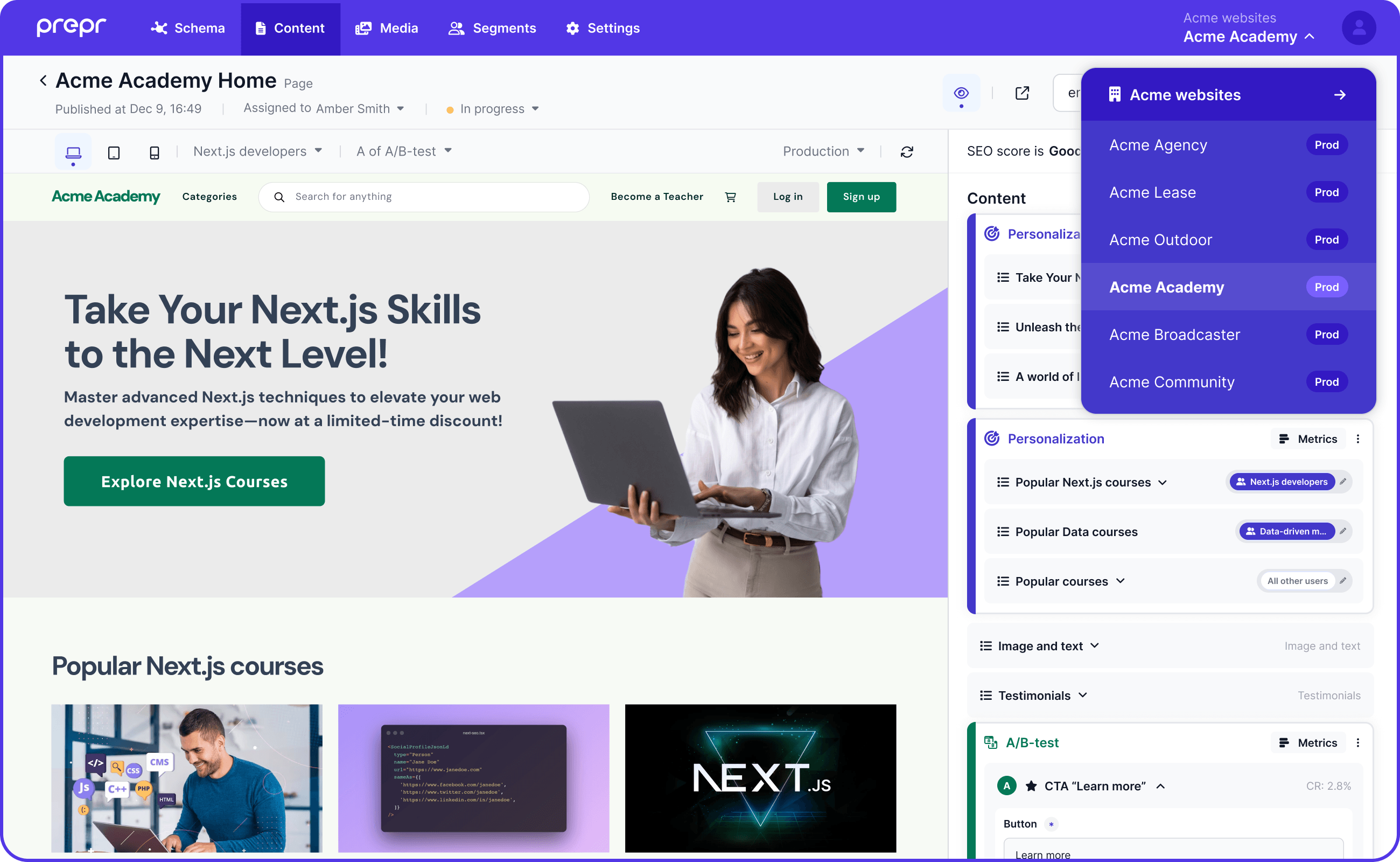 With shared schemas and reusable components, Prepr helps you maintain a clean, consistent architecture across sites—less duplication, fewer bugs, faster development.