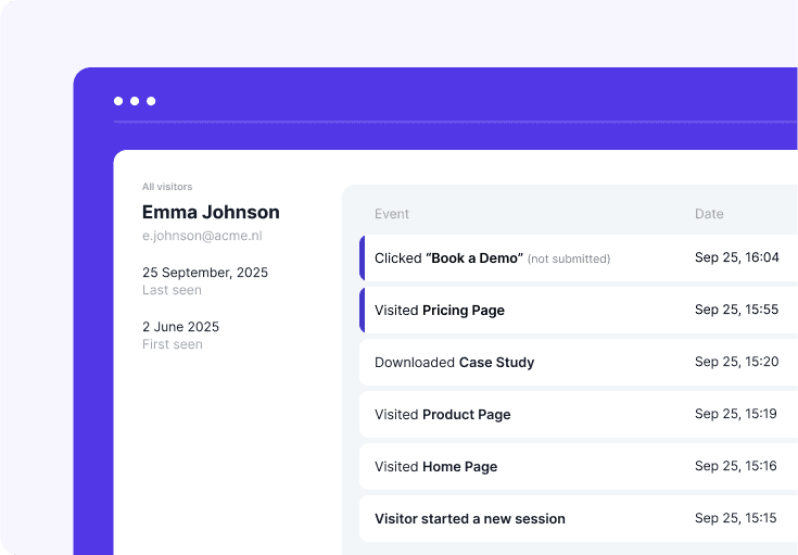 When visitors return multiple times or check out high-intent pages like pricing, those signals stay trapped in your CMS instead of reaching sales. Without this, your team misses the perfect moment to follow up — and valuable leads are lost.