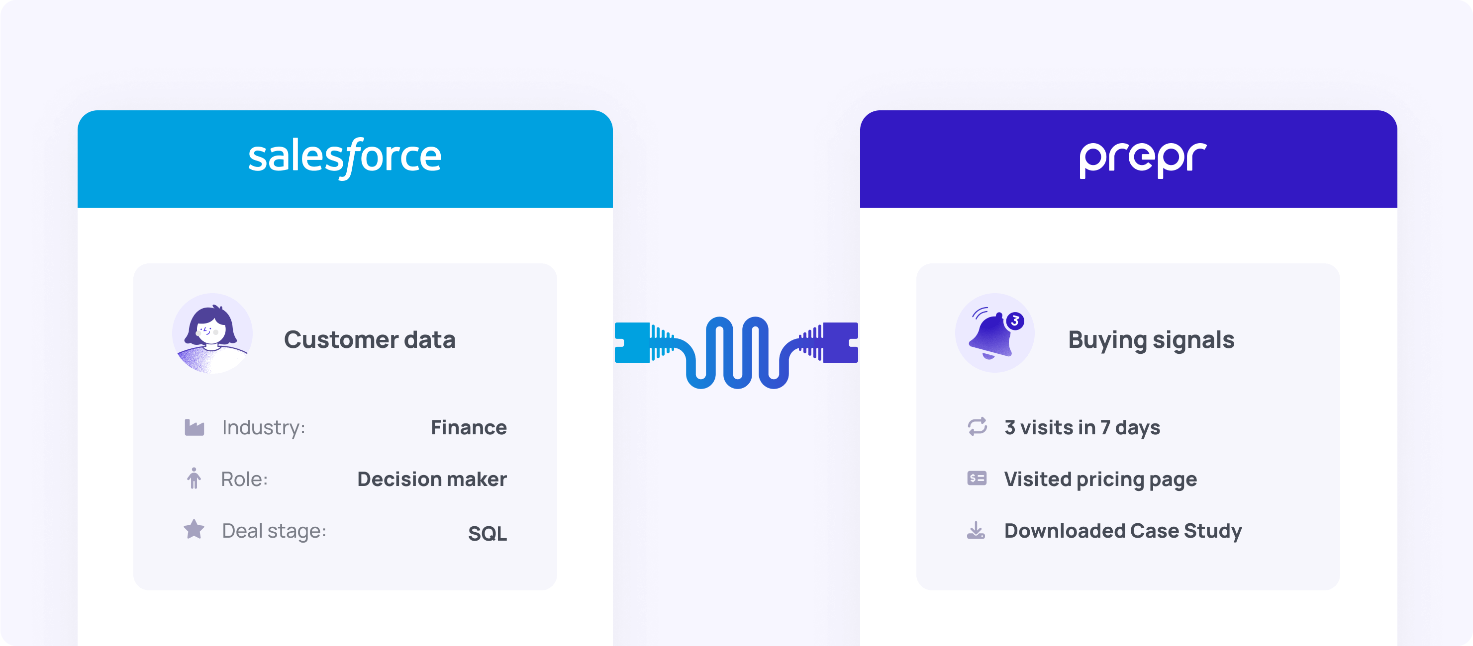 On most websites, visitor behaviors like repeat visits or pricing page views go unnoticed. Prepr captures these signals and sends them straight into Salesforce — so sales sees buying intent instantly and can act at the right time.